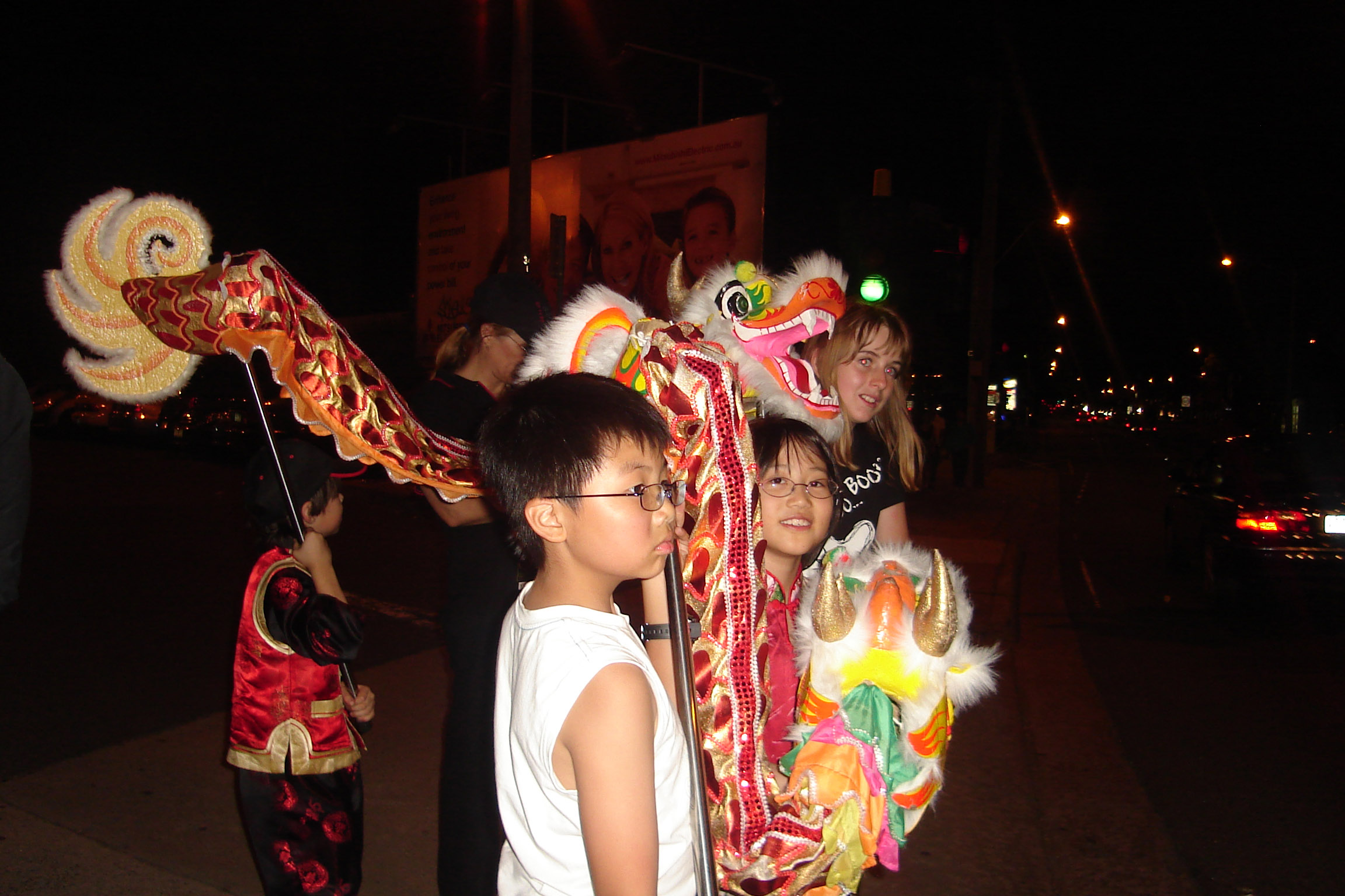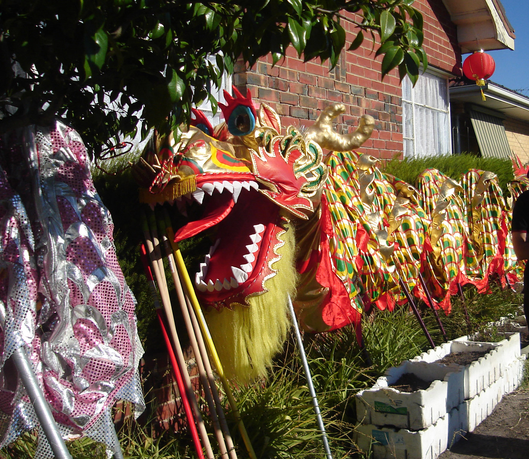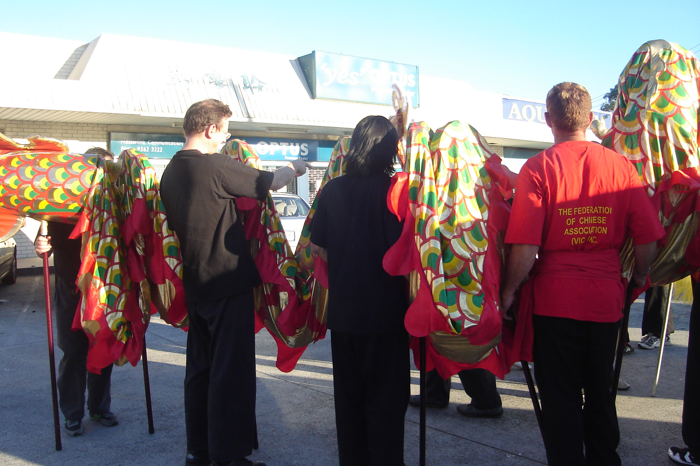 As luck would have it, that’s exactly what happened to us when our martial arts teacher, Sifu Dana Wong, sent out a distress call for help with the dragon of the Federation of Chinese Associations (Vic) Inc., when regular members of the dragon dance team were unable to come and person power was needed for a gig at the Springvale Chinese New Year Festival last Sunday night. Big Bruce, as this dragon is affectionately known, was a gift to the Federation from the Chinese consulate and is intended for use both as a dynamic manifestation of living tradition and as a cultural artefact reaching out to the community at large.