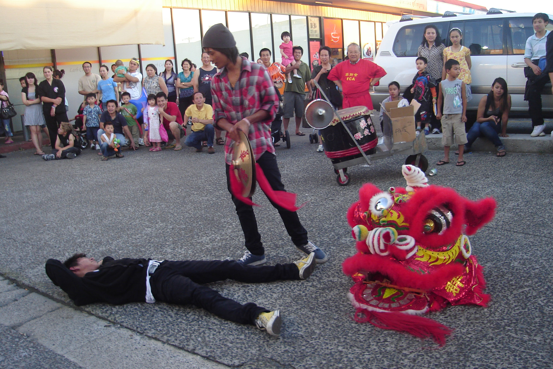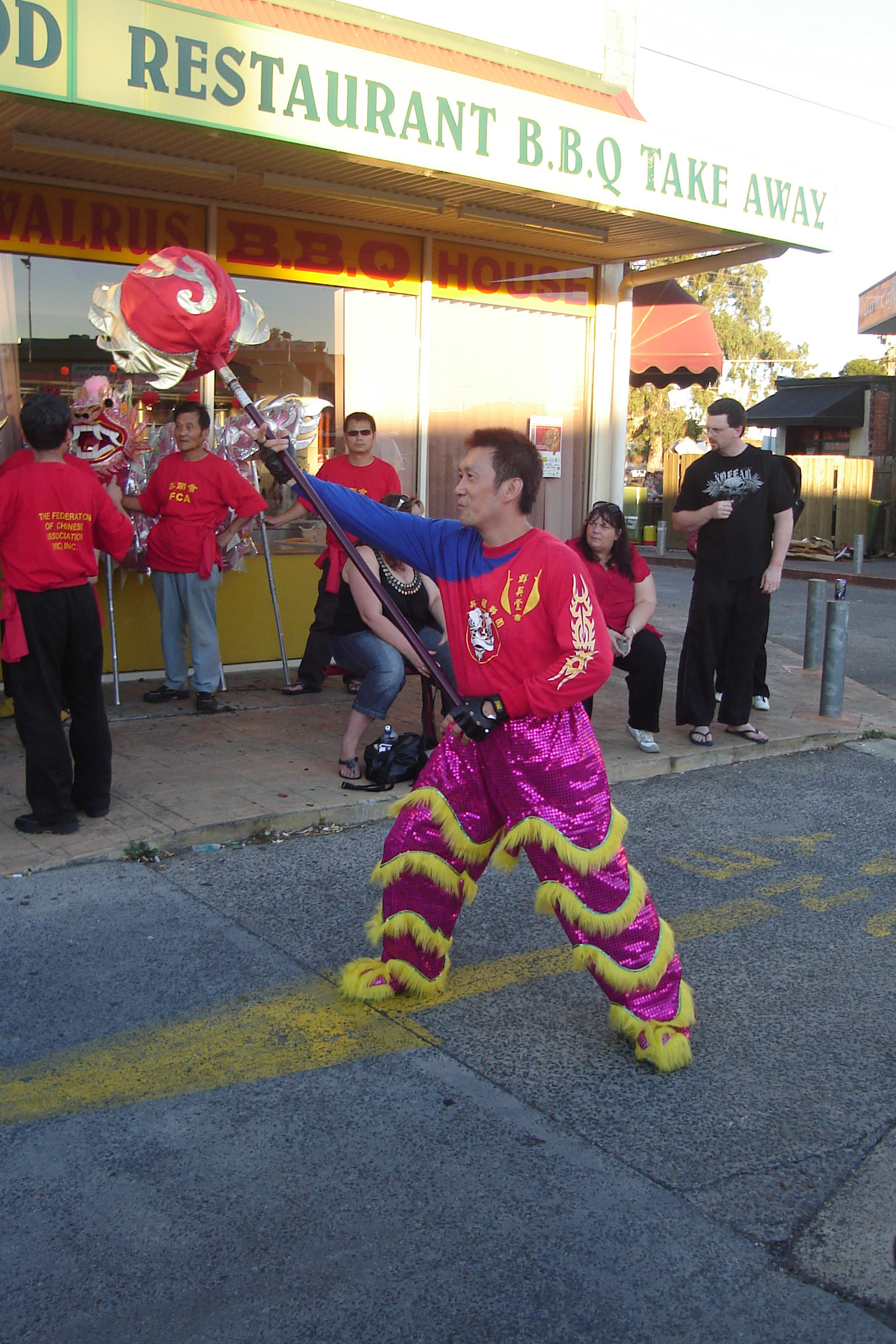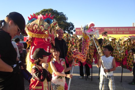 Lion Dance is performed as a competition between two lions, each one worked by a team of two very acrobatic performers. The lions appearing with us were the Melbourne Quan Anh Lion Dance. The dancers received some last minute coaching from the dazzlingly athletic David Tang, who cross trains in various martial arts including Choy Li Fut and Hung Gar. He lead both lions and dragons, working the dragon’s pearl – the spherical, flame-edged object of the dragon’s pursuit, symbolising wisdom, prosperity and universal energy as expressed by the concept of chi (Qi). It was a merry, exuberant dance as David leapt, spun and dashed about, wielding a sceptre topped with the enticing pearl. Sometimes he would throw himself down onto one knee and make the dragons jump over the pearl.