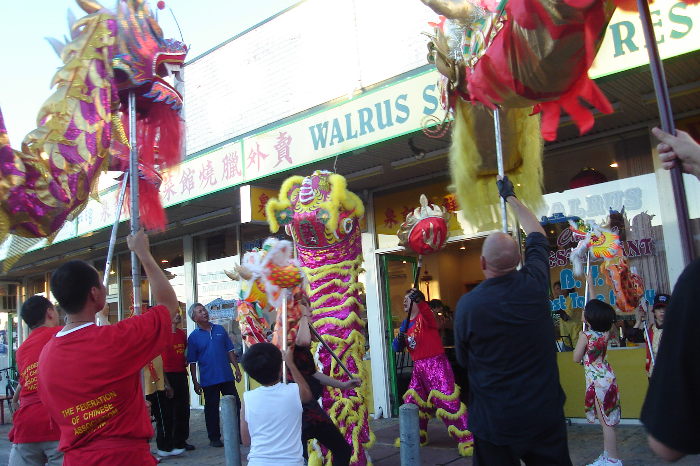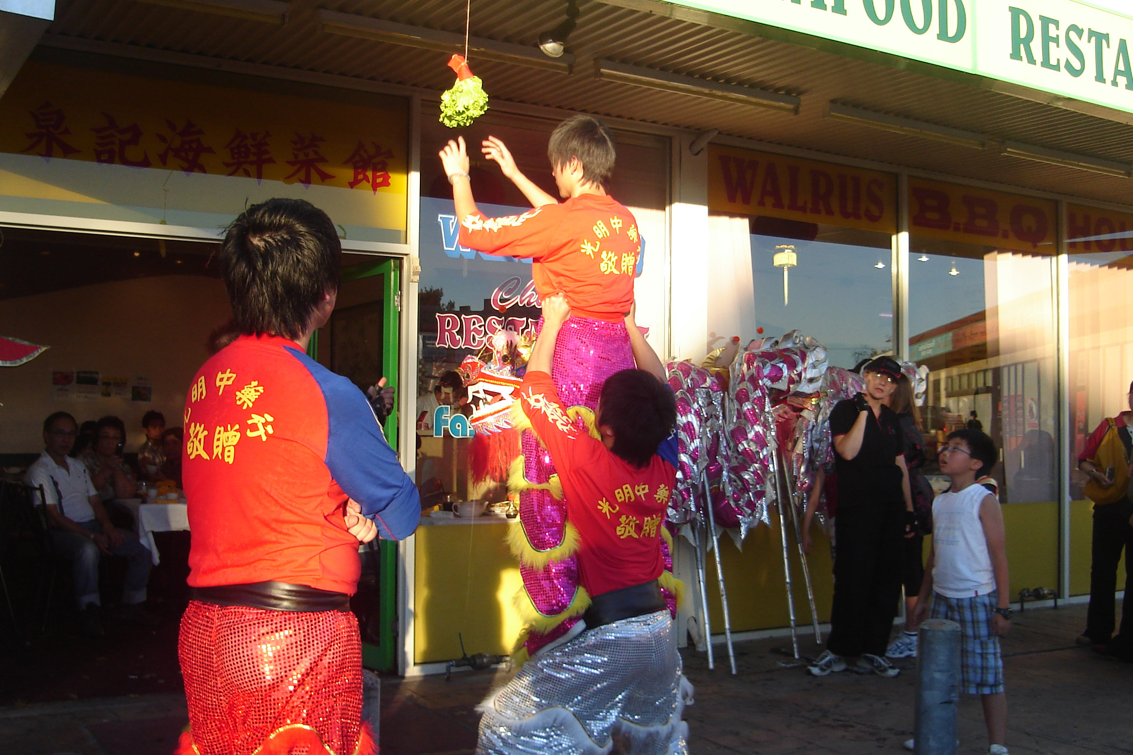Just as the dragon has nine different creature components – the whiskers are not counted, except in my personal observation – so Big Bruce needs nine handlers. However, many parade dragons are much much, longer – the Melbourne Millennium Dragon being the longest in the world – and some are quite short. At Springvale, Big Bruce performed with several other two and three-stick dragons. In one glorious sequence, all dragons came together, rising majestically in support of the Lion Dance victor, as it reached high to snatch the victor’s prize of lettuce and money dangling from the veranda roof of Walrus Seafood Restaurant. In a kung fu miracle, my wing chun skills enabled me to take a snap of this magnificent moment although I, too, was ramming a stick into the stratosphere.