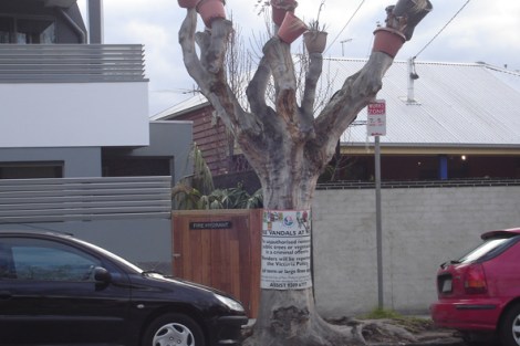 Our heritage: In Barkly St, St Kilda, a new multi-unit development is squeezed onto a small block of land, until recently occupied by a very old, locally unique, weatherboard house. The plane tree in front was illegally mutilated, before the house was demolished. The pot plants were attached by someone to indicate that there should be growth on the now-dead limbs.
